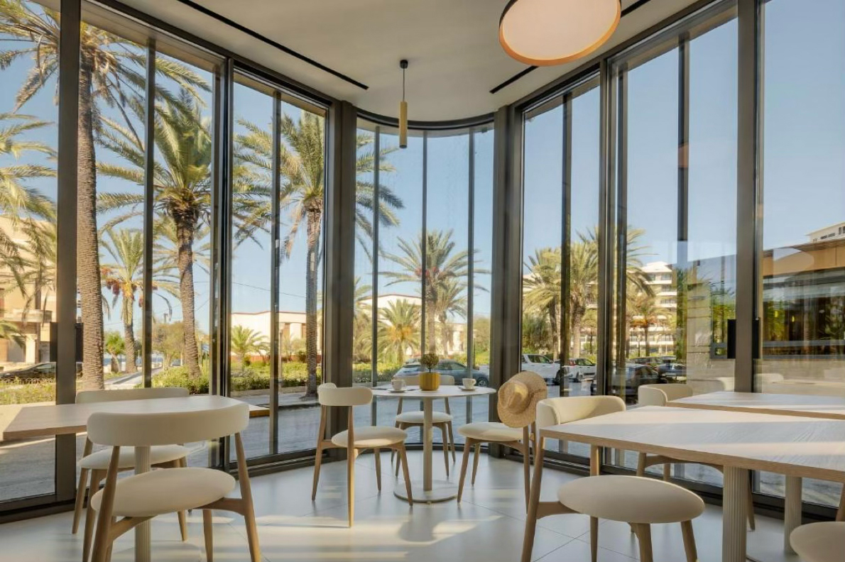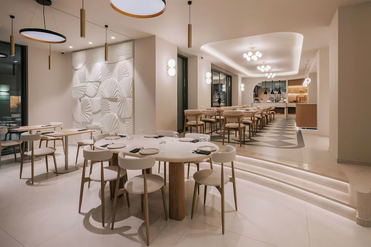 At ground level, curved glass surfaces shape the entrance and create visual continuity between the square and the hotel’s public spaces.